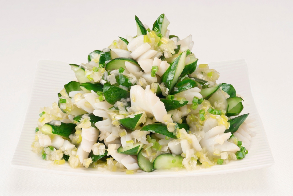 柔らかいイカとシャキシャキの胡瓜にさっぱりとしたネギショウガソースが相性抜群。