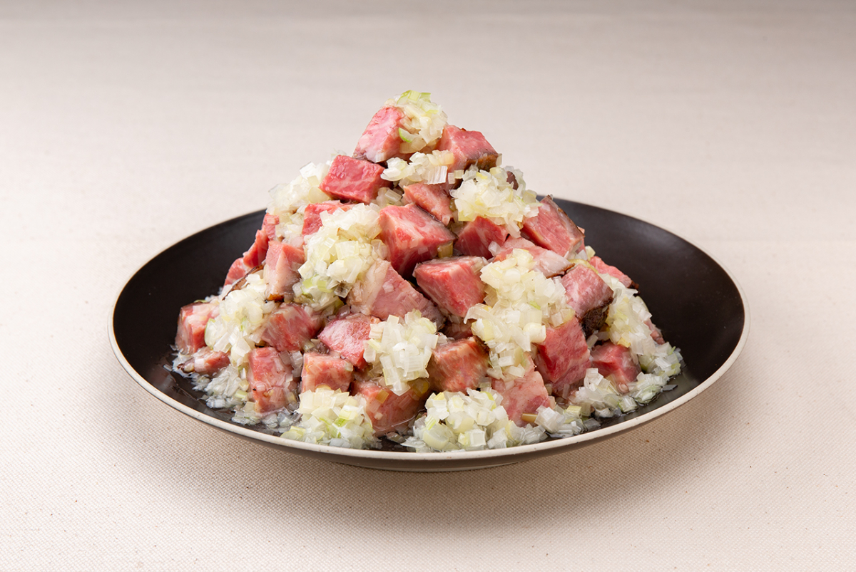しっとりやわらかなローストビーフに、ほんのり花椒(かしょう)の効いた葱塩ソースは、おつまみにもおすすめの一品です。たっぷりかかった瑞々しい葱が、お肉の旨みを引き立てます。