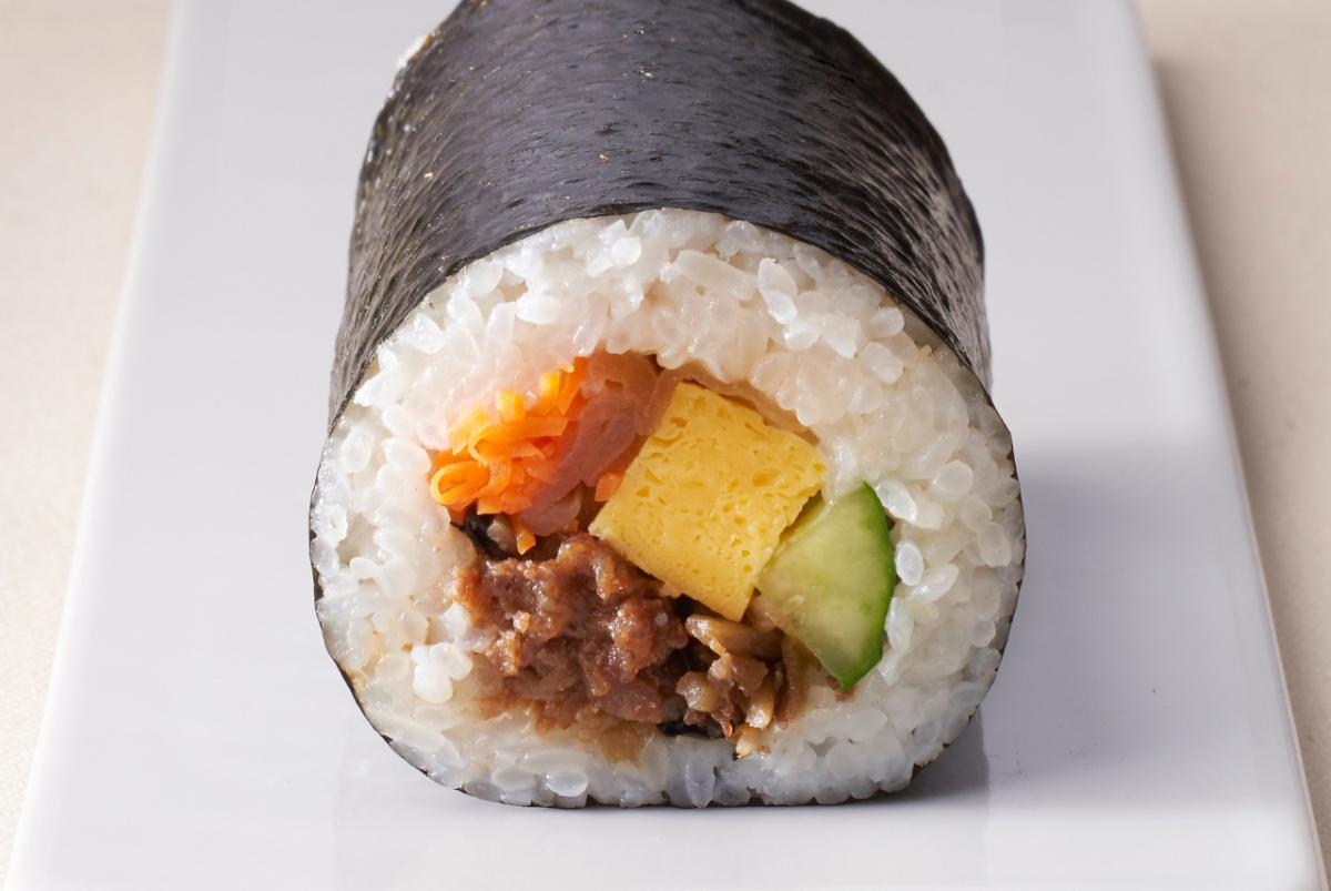 甘めに炊き上げた「牛肉しぐれ煮」は酢飯と相性抜群。金平の食感が楽しい恵方巻です。